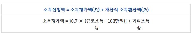 | 부부 가구 월 소득평가액 | [0.7 x (200만원 - 103만원 ) + 30만원 ] + [0.7 x (150만원 -103만원)] = 130.8만원 |