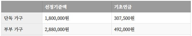 아래 표로 가구당 기초연금액을 참고해주세요.