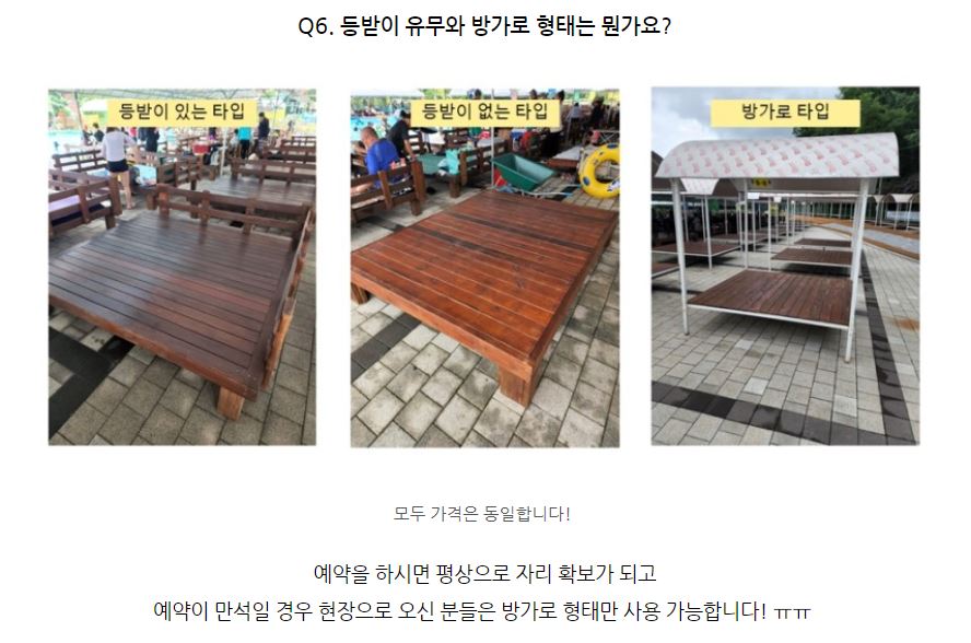 입장권과는 별개로 평상&방갈로를 사용하시려면 먼저 홈페이지를 통해 예약하시면 됩니다.