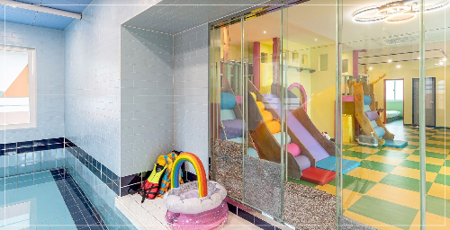 객실 마다 실내대형수영장, 미끄럼틀, 놀이시설이 되어있어,